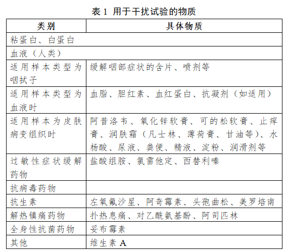 应根据所采集样本类型,针对可能存在的内源/外源物质干扰情况进行验证,验证推荐物质见表1。建议申请人在每种干扰物质的潜在最大浓度条件(“最差条件”)下进行试验,检测包含临界阳性水平在内的猴痘病毒样本。对结果进行合理的统计分析,对比添加干扰物质前后的 Ct 值差异。检测的潜在干扰物包括样本中的原有物质及在样本采集和处理期间引入的物质。