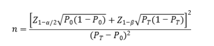 公式中,n为样本量;Z1-α/2、Z1-β为显著性水平和把握度的标准正态分布的分数位,P0为评价指标的临床可接受标准,PT为试验体外诊断试剂评价指标预期值。其中,阴阳性符合率的临床可接受标准(P0)建议不低于90%。