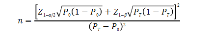 公式中,n为样本量;Z1-α/2、Z1-β为显著性水平和把握度的标准正态分布的分位数,P0为评价指标的临床可接受标准,PT为试验体外诊断试剂评价指标预期值。