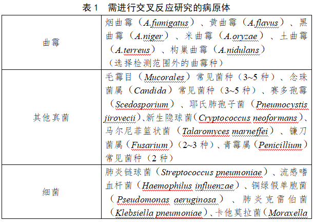 阴性参考品:主要涉及对交叉反应的验证情况,建议包括定植部位相同、引发症状相近的其他病原体,包括检测范围外的曲霉种(烟曲霉、黄曲霉、黑曲霉、米曲霉、土曲霉、构巢曲霉)、毛霉目常见菌种、念珠菌属常见菌种、赛多孢霉、耶氏肺孢子菌、新生隐球菌、马尔尼菲篮状菌、镰刀菌属、青霉属。