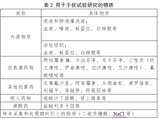 应根据所采集样本类型,针对可能存在的内源/外源物质干扰情况进行验证。建议申请人在每种干扰物质的潜在最大浓度(“最差条件”)条件下进行试验,检测包含临界阳性水平在内的曲霉样本。对结果进行合理的统计分析,对比添加干扰物质前后的 Ct 值差异。检测的潜在干扰物包括样本中的原有物质及在样本采集和处理期间引入的物质。用于干扰试验研究的物质具体见表2。