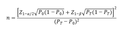 公式中,n为样本量;Z1-α/2、Z1-β为显著性水平和把握度的标准正态分布的分数位,P0为评价指标的临床可接受标准,PT为申报产品评价指标预期值。
