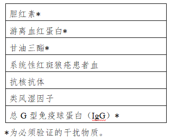 9.6.3干扰物质:样本中常见干扰物质对检测结果的影响,如血红蛋白、甘油三酯、胆红素等,应注明可接受的最高限值。