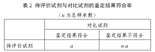 鉴定结果符合率:待评价试剂与对比试剂鉴定结果一致的样本数占总样本数的比例。即:鉴定结果符合率=a/n×100%。