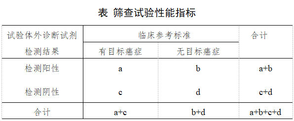 针对不同的癌症、不同的适用人群等,性能评价指标可能有不同的侧重,申请人应合理确定预期可接受标准,并提供依据。同时建议针对入组受试者中不同风险因素人群进行亚组分析。