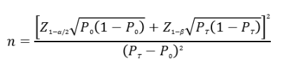 应针对所有标志物(如适用)分别估算阳性样本量和阴性样本量,建议采用单组目标值法公式,目标值(P0)设定应有合理依据,基因突变或甲基化等核酸标志物检测目标值建议不低于90%。