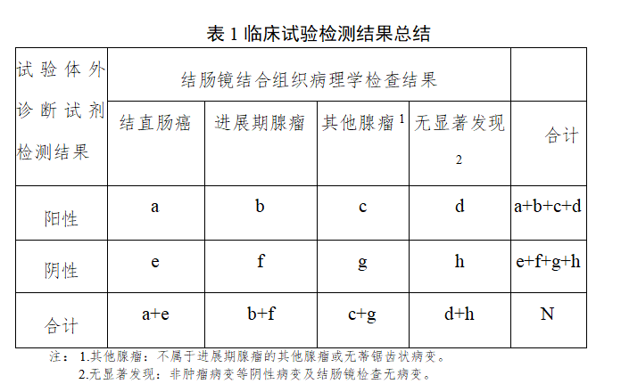 对临床试验结果进行总结。计算灵敏度、特异度并计算95%置信区间;同时应针对结直肠癌不同分期、以及进展期腺瘤患者分别计算灵敏度;针对不同类型肠道良性疾病患者、其他不同癌种病例以及肠道无显著发现患者分别分析特异度。