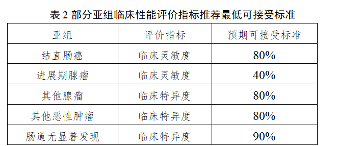 依据临床需求和已报道研究数据,部分关键亚组临床性能评价指标推荐的最低可接受标准(95%置信区间下限)参下表: