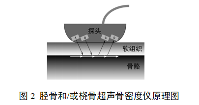 胫骨和/或桡骨超声骨密度仪的工作原理是通过轴向反射技术测量超声波沿平行于胫骨或桡骨方向的SOS,同时计算出一组参数,来反应骨质状况。当超声波从一波疏介质入射到一波密介质时,将在两种介质界面上产生反射波和折射波现象。随着入射角度增大,折射角度也逐渐增大,当入射角达到某一特定值时,其折射方向恰好与骨表面方向平行,并在骨表面前进一段距离后,又以相同的出射角从骨表面射出。第一次到达信号的传播时间即可以被测量并用于计算速度。仪器的探头通常由对称的四个晶片组成,如图2所示,其中A、B晶片发射超声波,C、D晶片接收超声波,仪器通过接收到超声波的时间差来计算轴向速度。该速度可以直接反映骨质密度的大小,骨密度下降时,超声传导速度减小。