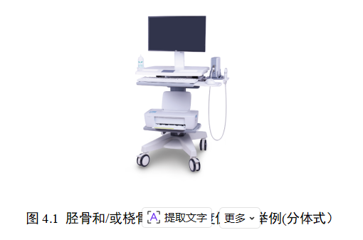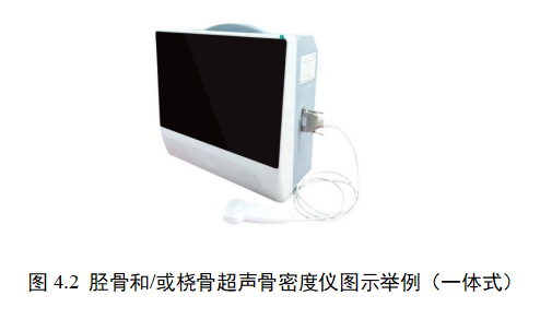 胫骨和/或桡骨超声骨密度仪通常由主机、超声探头、配件和软件组成,主机包括发射电路、接收电路、主控信号单元和电源单元,配件可包括电源适配器、校准模块、电源线、接口线缆(如USB线缆、探头线)、软件载体、脚踏开关、工作站等。图4给出了胫骨和/或桡骨超声骨密度仪典型产品的图示举例。