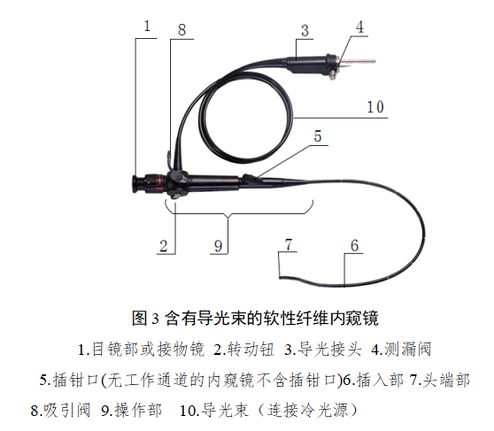 含有导光束的软性纤维内窥镜由头端部、插入部、操作部、目镜部或接物镜、导光插头、导光束、吸引阀(如适用)等组成。