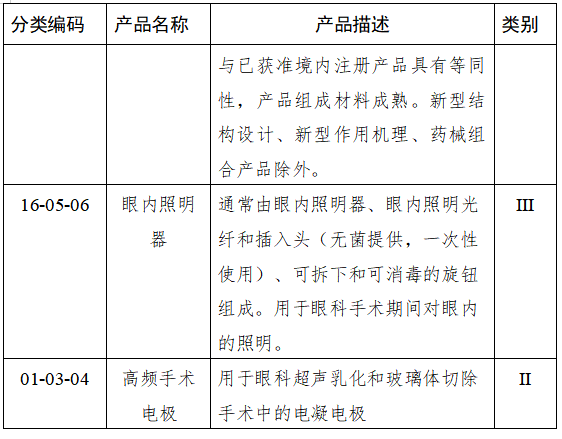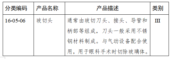 《医疗器械分类目录》中分类编码16-05-05的“其他眼科治疗和手术设备(玻璃体切割器、玻切加速机)”、 16-05-06的“眼科治疗和手术辅助器具(眼内照明器、玻切头、注吸仪、眼科超声乳化手术仪用附件)”可参考本指导原则中适用的内容。